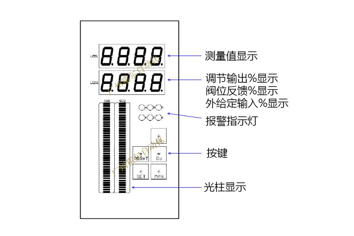 ★单通道输入,双屏LED数码,40段双光柱显示。测量值、给定值、阀位、控制量等多重数显和光柱指示。
