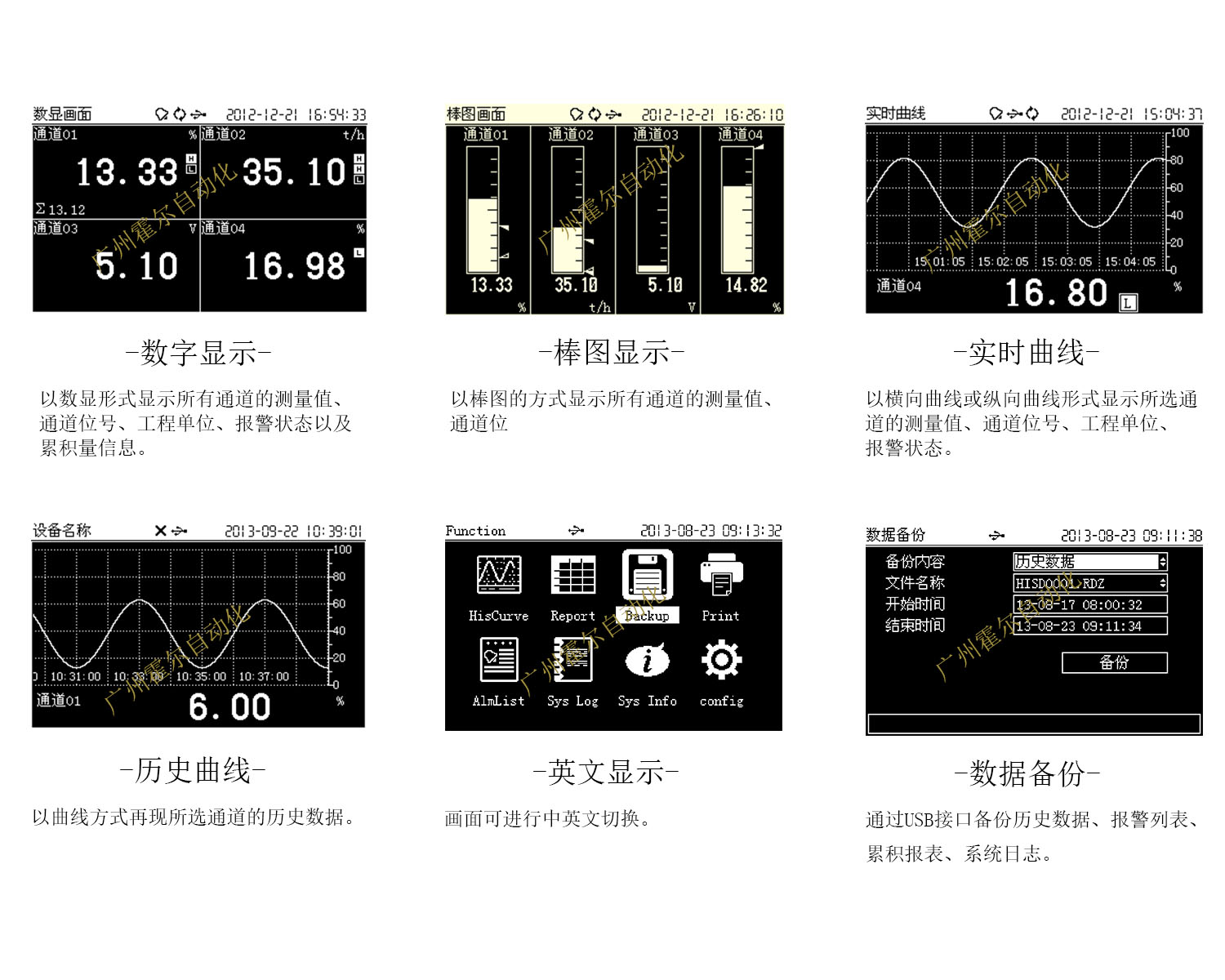 ▪ 画面显示:测量数据(总览、数字显示、棒图显示、曲线显示) 功能画面(历史曲线、累积报表、数据备份、数据打印、报警列表)