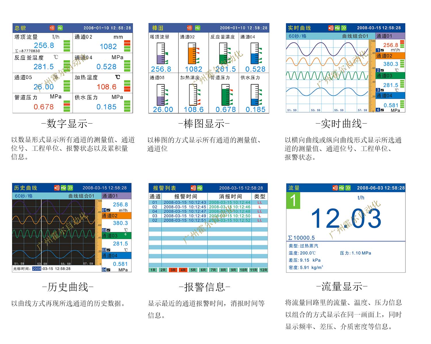 具有传感器隔离配电输出、继电器报警输出、变送输出、流量积算、温压补偿、累积报表、历史数据转存、打印以及远程通讯功能。
