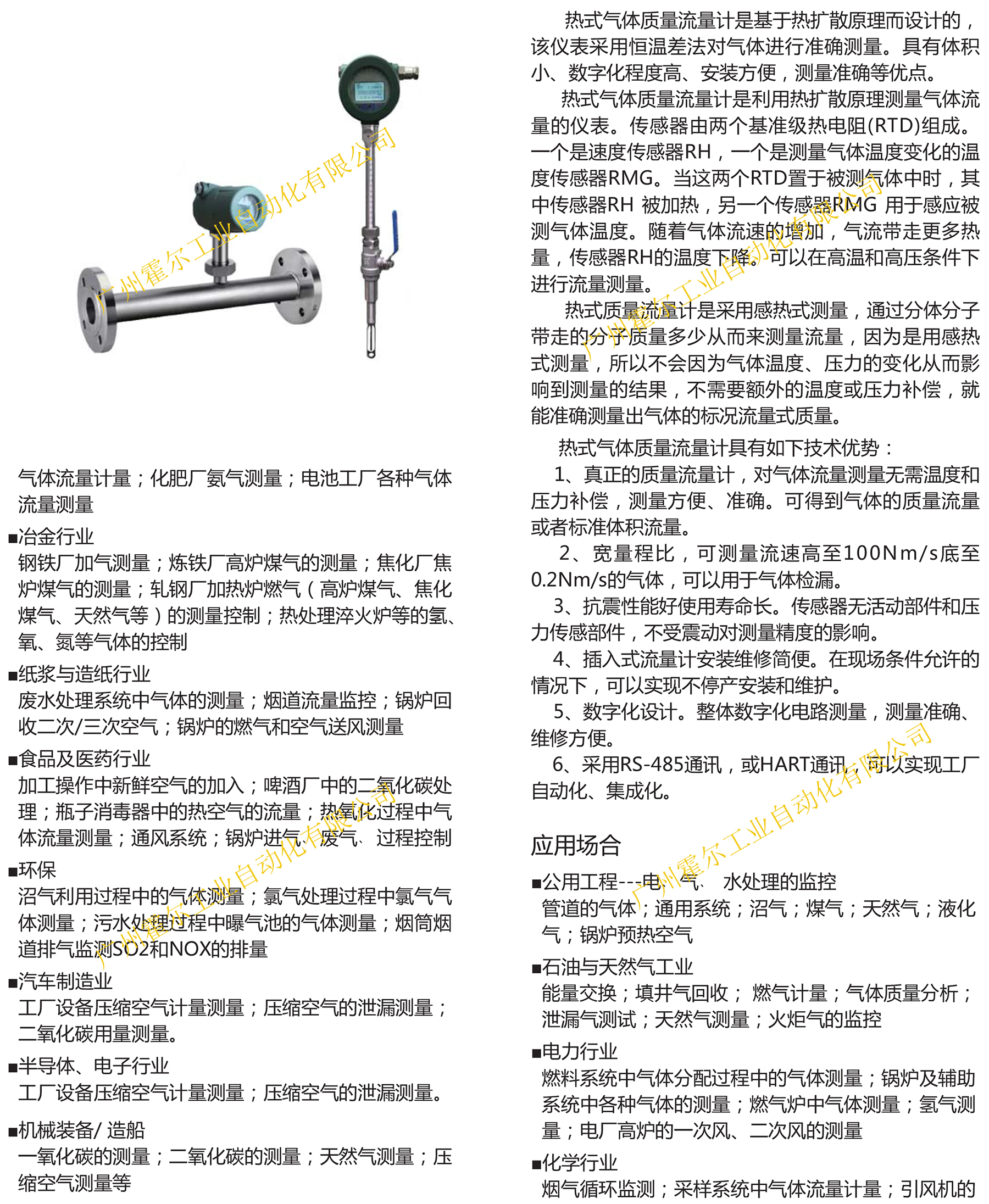 1、真正的质量流量计,对气体流量测量无需温度和压力补偿,测量方便、准确。可得到气体的质量流量或者标准体积流量。 2、宽量程比,可测量流速高至100Nm/s底至0.2Nm/s的气体,可以用于气体检漏。 3、抗震性能好使用寿命长。传感器无活动部件和压力传感部件,不受震动对测量精度的影响。 4、插入式流量计安装维修简便。在现场条件允许的情况下,可以实现不停产安装和维护。 5、数字化设计。整体数字化电路测量,测量准确、维修方便。 6、采用RS-485通讯,或HART