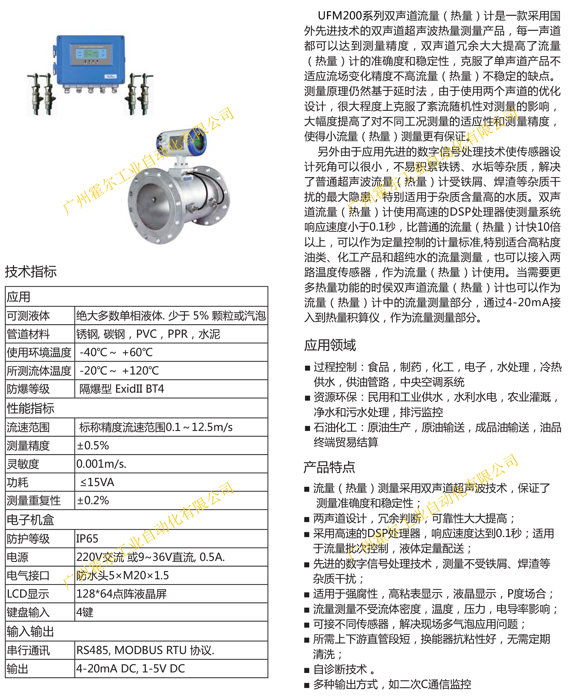 UFM200系列双声道流量(热量)计是一款采用国外先进技术的双声道超声波热量测量产品,每一声道都可以达到测量精度,双声道冗余大大提高了流量(热量)计的准确度和稳定性,克服了单声道产品不适应流场变化精度不高流量(热量)不稳定的缺点。测量原理仍然基于延时法,由于使用两个声道的优化设计,很大程度上克服了紊流随机性对测量的影响, 大幅度提高了对不同工况测量的适应性和测量精度, 使得小流量(热量)测量更有保证。