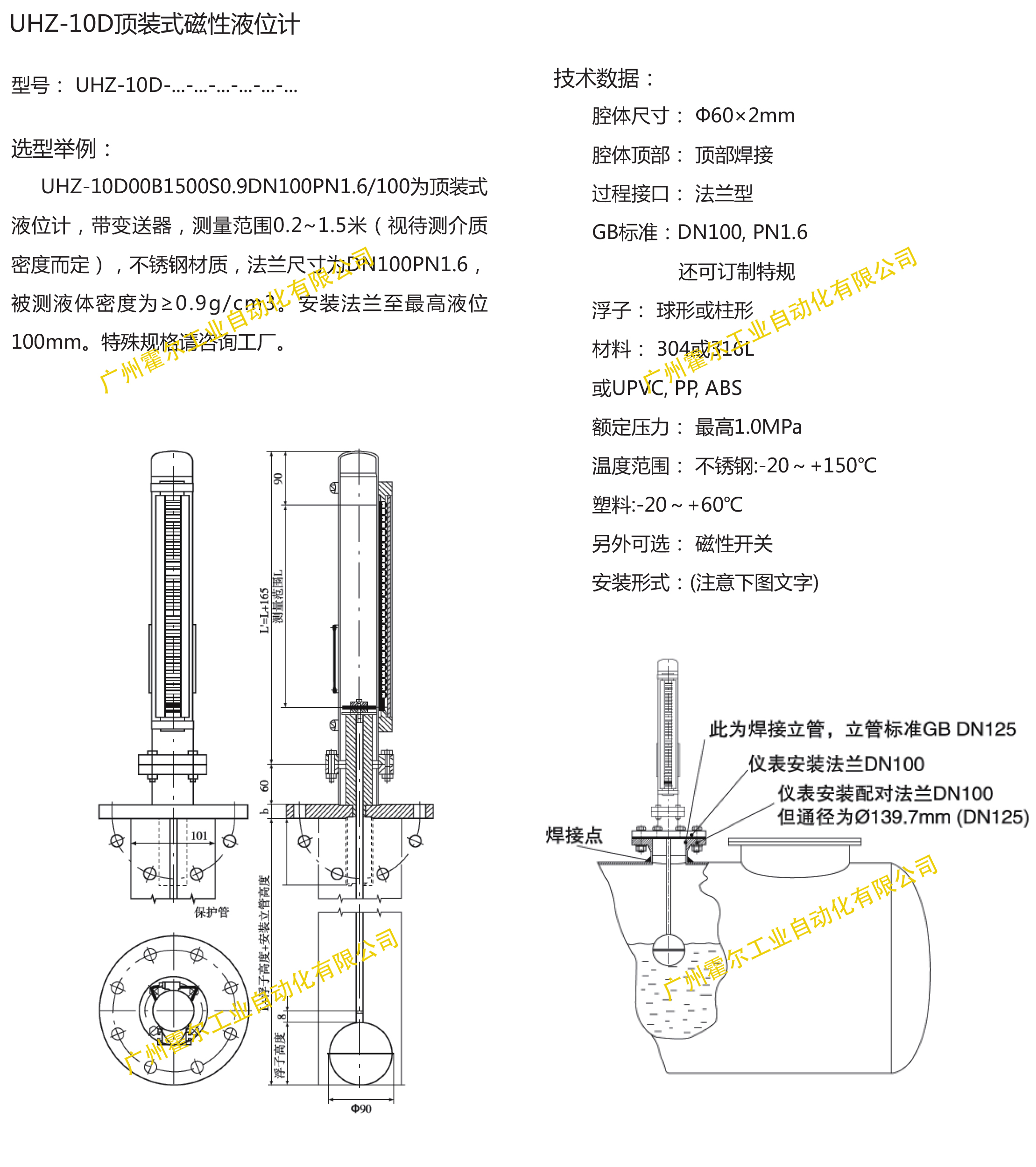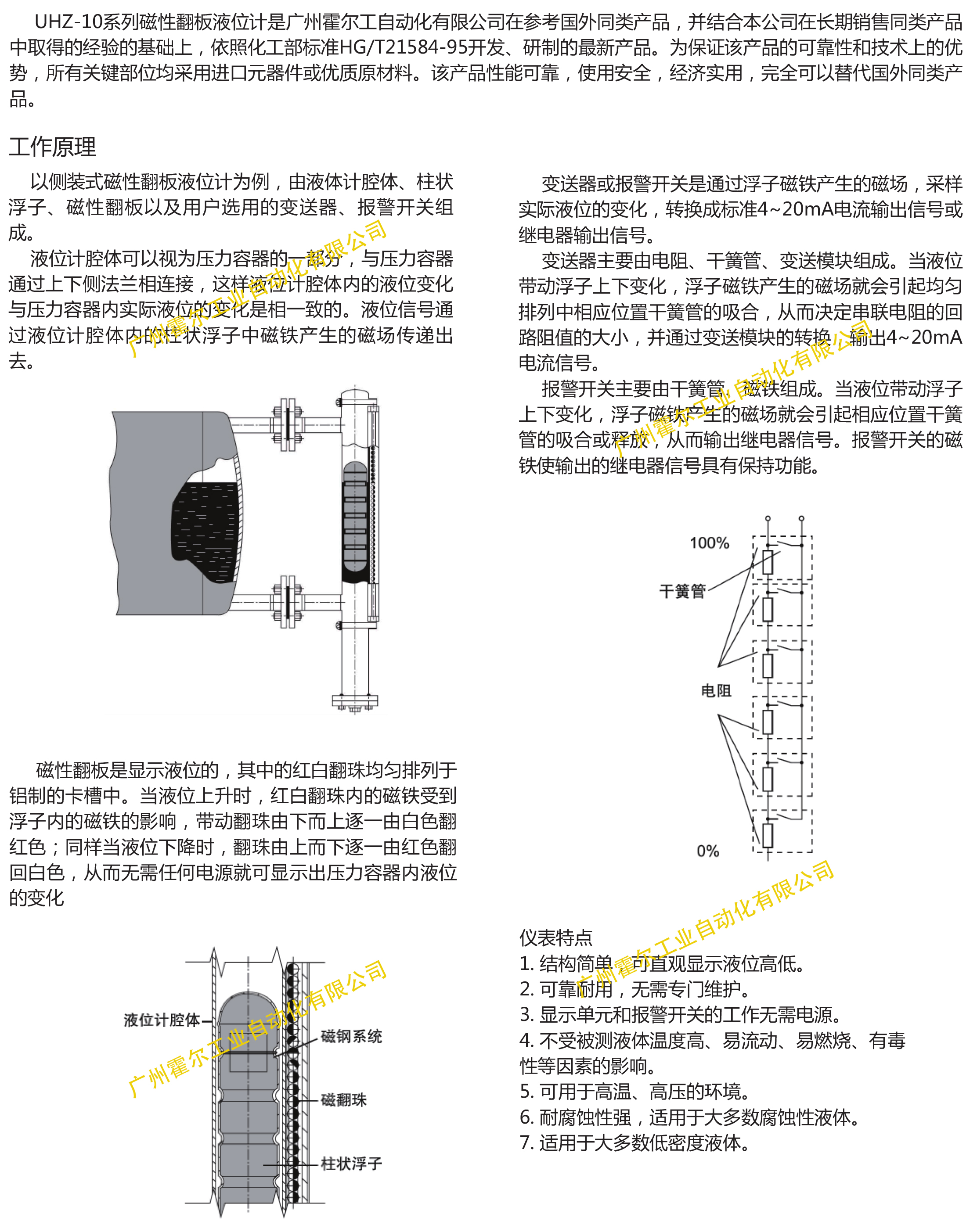 UHZ-10系列磁性翻板液位计是广州霍尔工自动化有限公司在参考国外同类产品,并结合本公司在长期销售同类产品中取得的经验的基础上,依照化工部标准HG/T21584-95开发、研制的最新产品。为保证该产品的可靠性和技术上的优势,所有关键部位均采用进口元器件或优质原材料。该产品性能可靠,使用安全,经济实用,完全可以替代国外同类产品。
